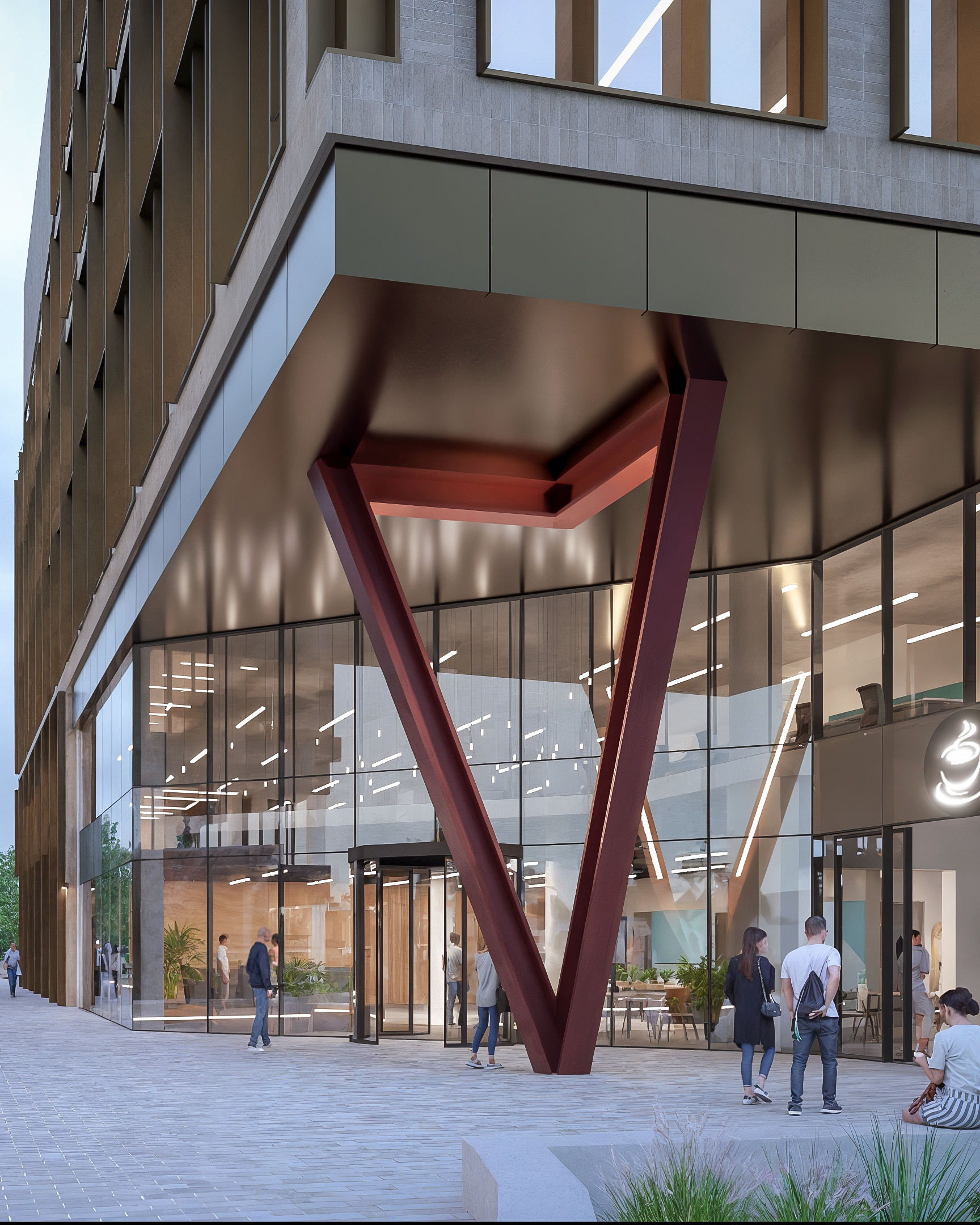 The project is targeting a BREEAM ‘Excellent’ rating and an EPC Rating A, both of which are underpinned by the building’s passive design principles. The high-performance façades balance glazing with solar shading to maximise the efficiency of ventilation and heat recovery. The building is set to be all-electric, with power generated on-site through photovoltaic panels and air source heat pumps.