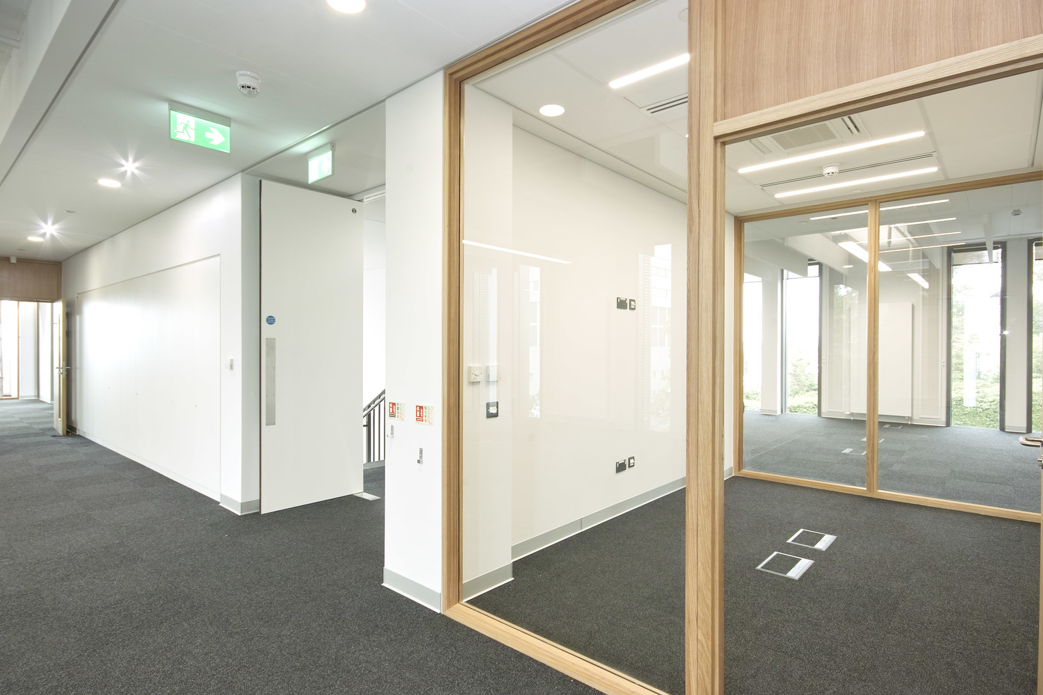 Within the building, the primary spaces are organised on either side of a circulation spine that incorporates the stairs, lift, shared facilities, amenities, and meeting rooms. Horizontal circulation is terminated at both ends by a glazed wall boasting far-reaching views of the adjacent conservation area.